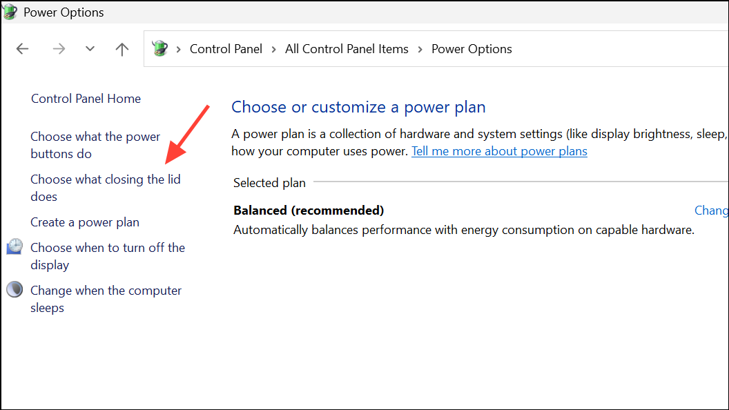 Step 2: Click Choose what closing the lid does in the left sidebar.