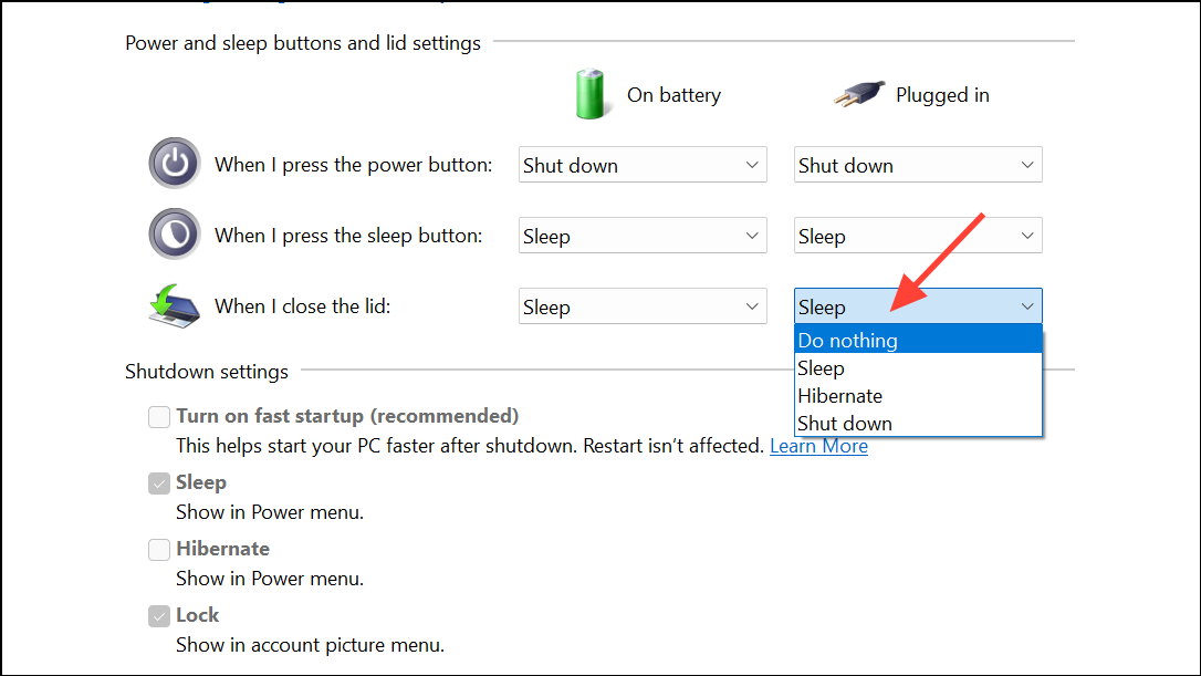 Step 3: For the Plugged in setting, set When I close the lid to Do nothing. This ensures the laptop stays powered on even when the lid is closed.