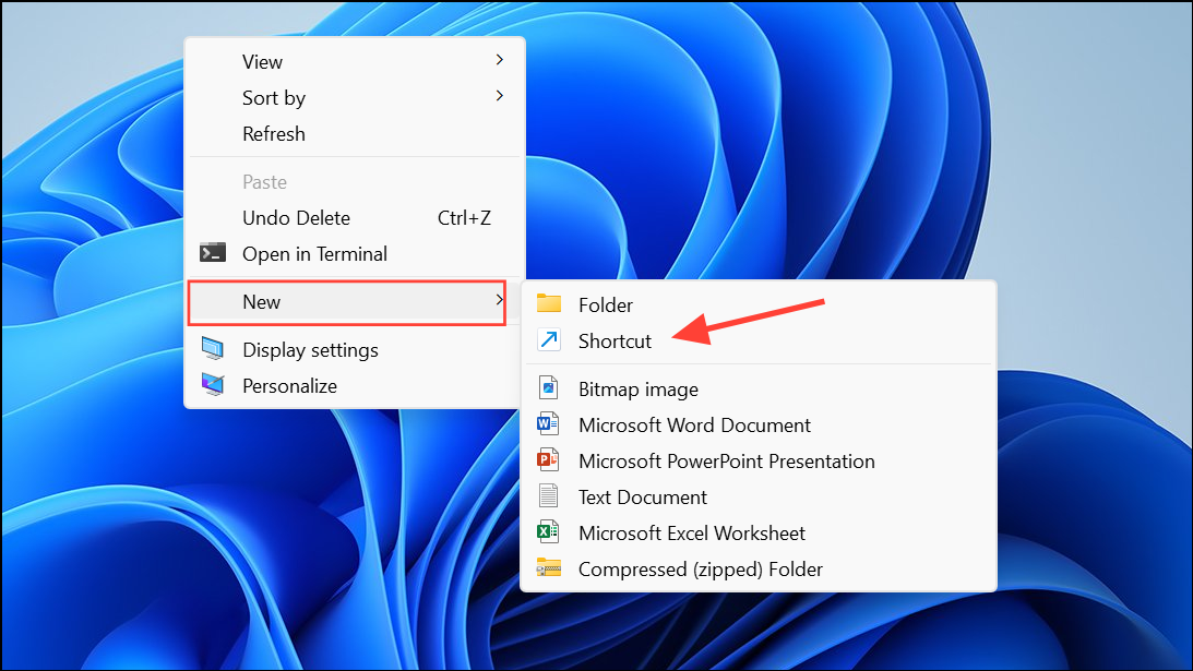 Step 2: Right-click on your desktop and select New > Shortcut.