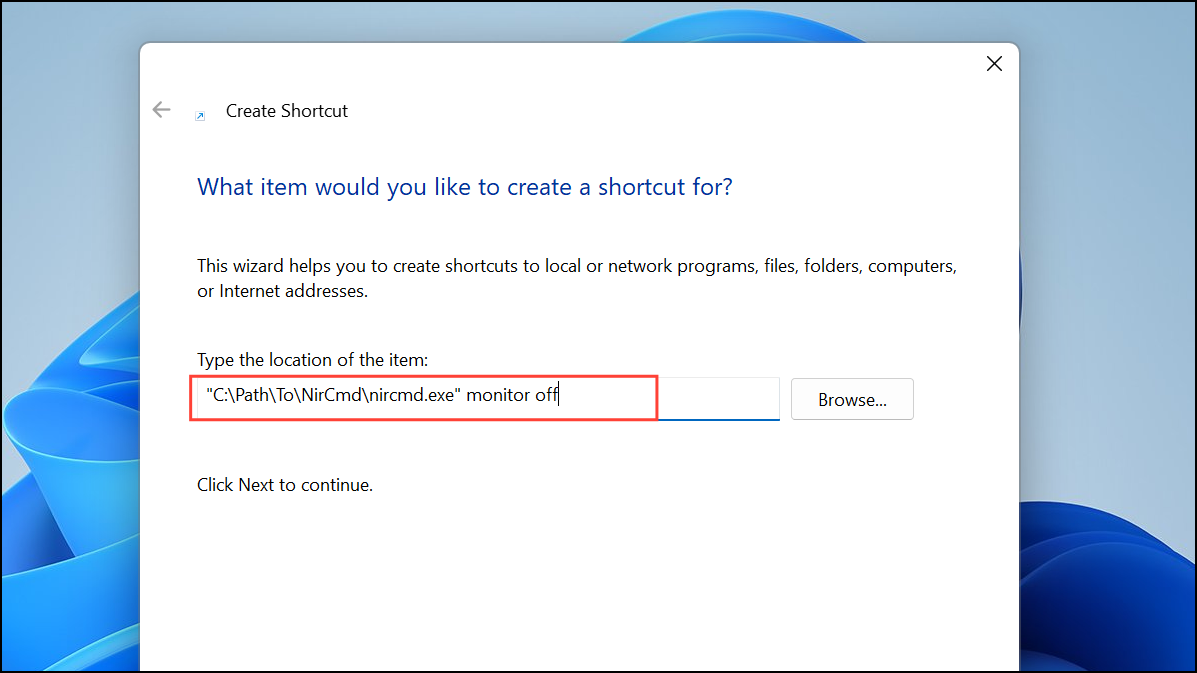 Step 3: In the location field, enter the path to NirCmd with the monitor off command, such as: