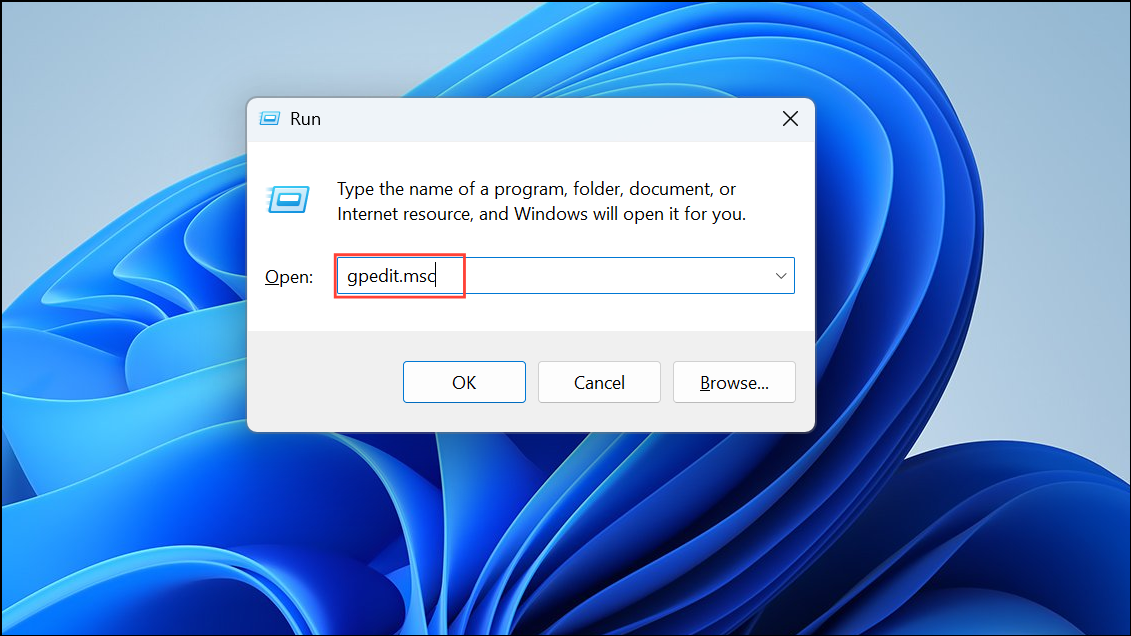 Step 1: Open the gpedit.msc tool. Press Windows + R, type gpedit.msc, and press Enter to launch the Local Group Policy Editor.