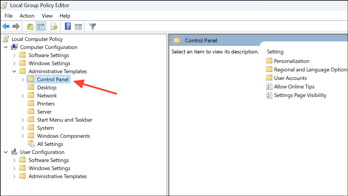 Step 2: Navigate to Computer Configuration > Administrative Templates > Control Panel or All Settings depending on your Windows version.