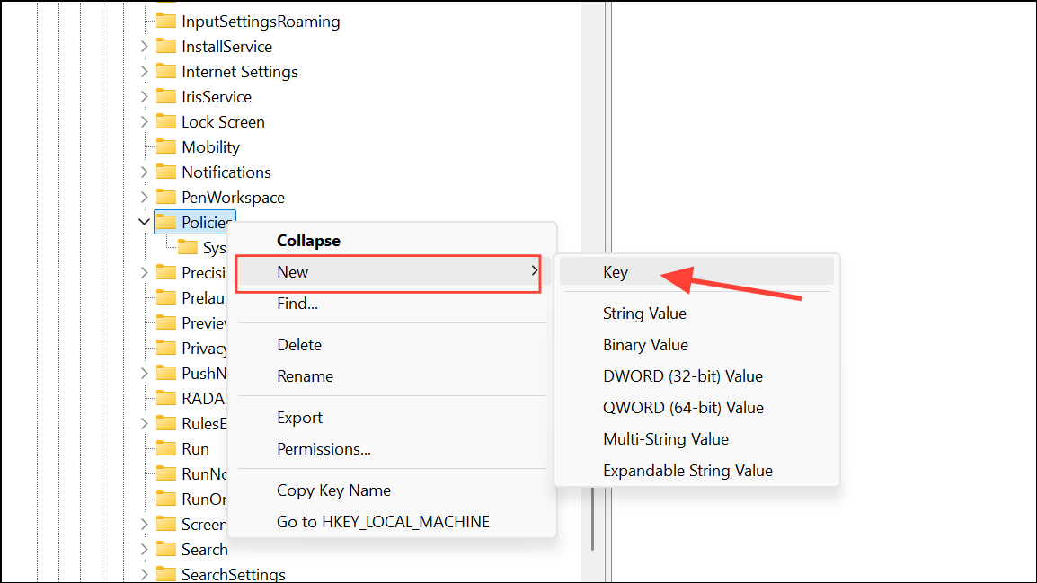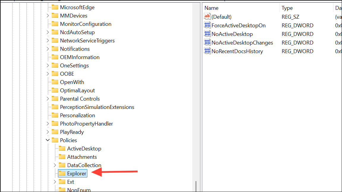 HKEY_CURRENT_USER\Software\Microsoft\Windows\CurrentVersion\Policies\ExplorerIf the Explorer key does not exist under Policies, right-click Policies, select New > Key, and name it Explorer.