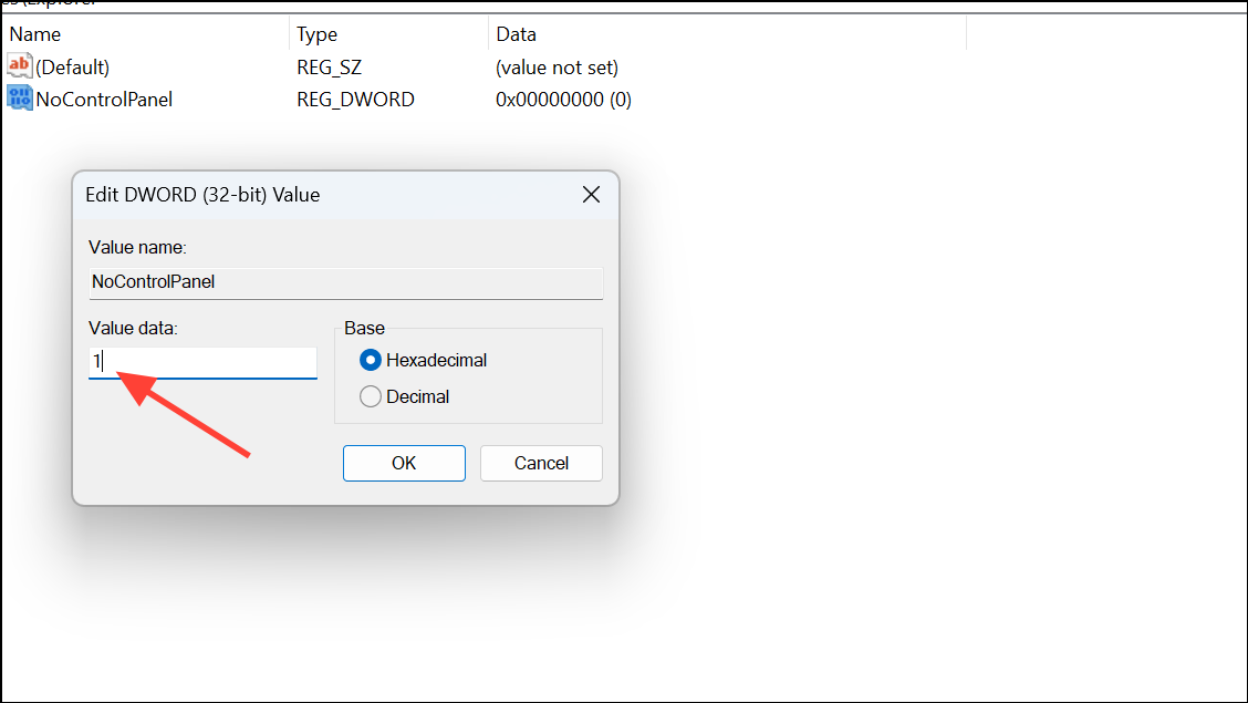 Step 4: Double-click the NoControlPanel value and set its data to 1. This action activates the restriction for the current user.