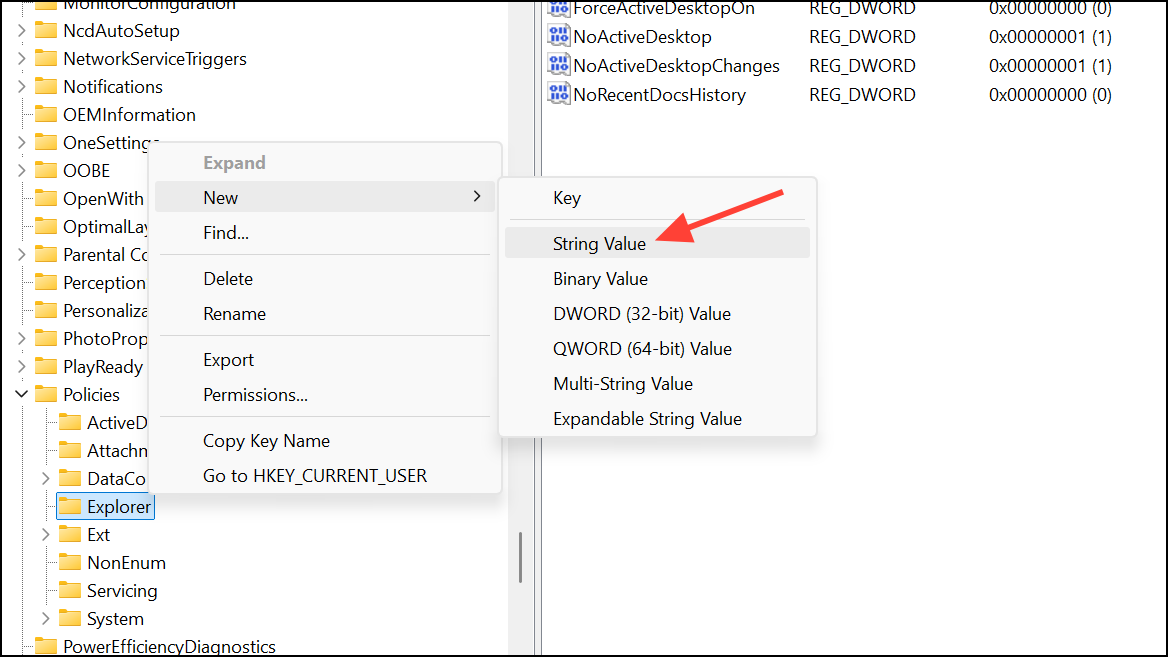 Step 2: Right-click the Explorer key and select New > String Value. Name it SettingsPageVisibility.