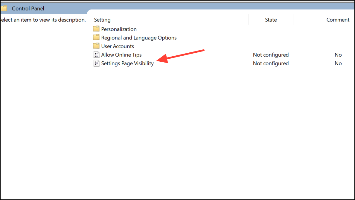 Step 3: Find and double-click Settings Page Visibility.