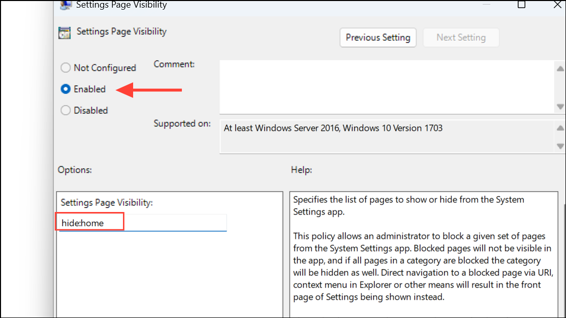 Step 4: Set the policy to Enabled and enter hide:home in the options field to hide the homepage. Click Apply and OK.
