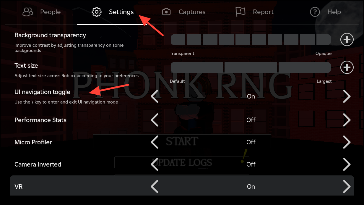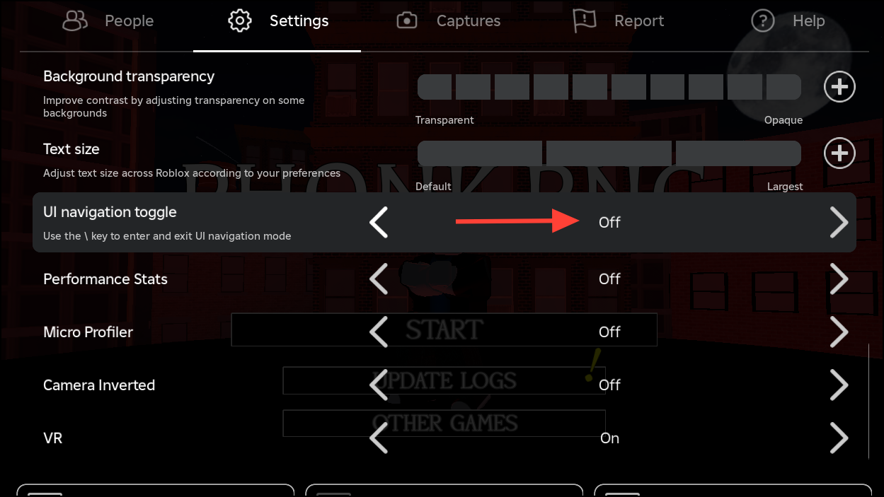 Press Esc, open Settings, and switch the UI Navigation Toggle to Off to prevent the keyboard shortcut from activating UI selection. This setting lives in the in-experience menu and controls whether the \ key can enter/exit UI navigation mode. See Roblox’s “In-experience Settings and Help” for where to find it: https://en.help.roblox.com/hc/en-us/articles/203314230-In-experience-Settings-and-Help.