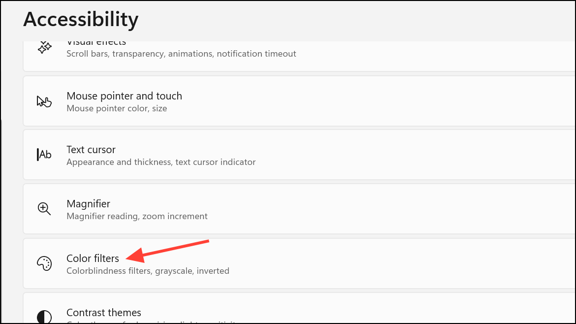 Step 2: In the Accessibility section, locate and select Color filters under the Vision category. This brings up the color filter configuration panel.