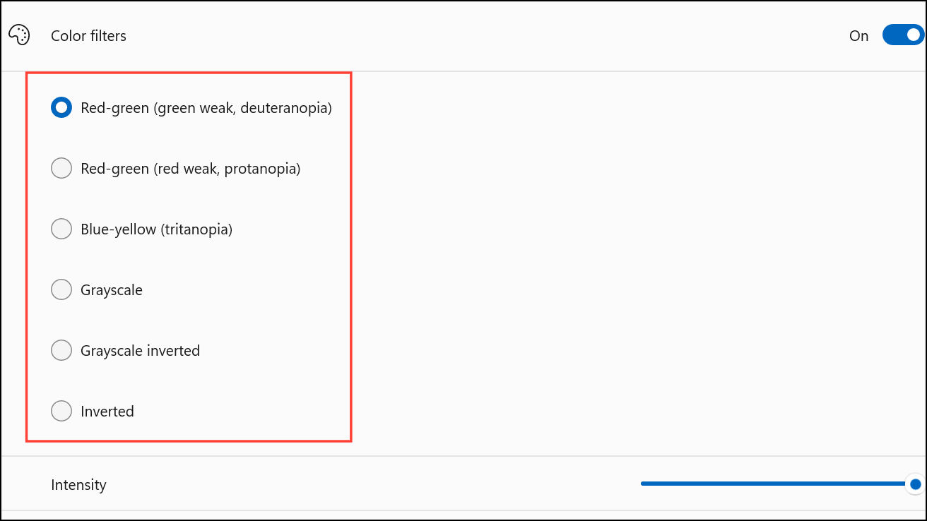 Step 2: Move the Intensity slider to increase or decrease how strongly the filter alters on-screen colors. Increasing intensity can make differences between similar colors more pronounced, while lowering it can keep the display closer to its original appearance.