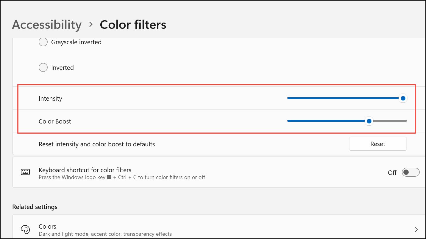 Adjust Color Filter Intensity and Color Boost (Windows Insider Builds)