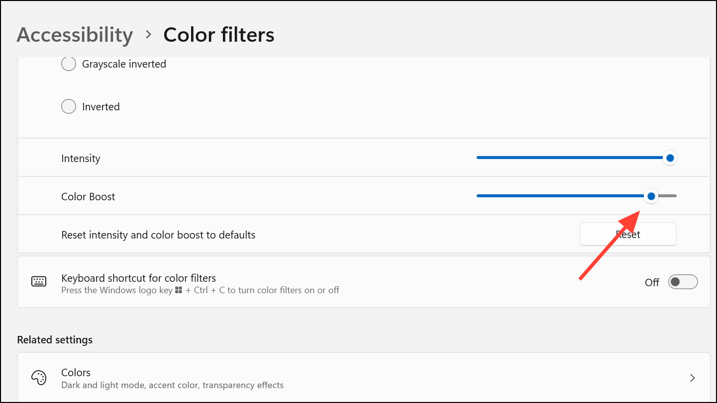 Step 3: Adjust the Color boost slider to control how vivid or saturated the filtered colors appear. Raising the color boost can make filtered colors stand out more, which is helpful if muted colors remain difficult to distinguish.