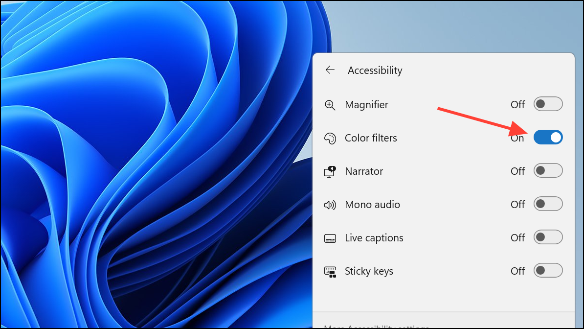 Step 3: In the Accessibility flyout, toggle Color filters on or off as needed. This method provides a fast way to adjust accessibility features without opening the full Settings app.