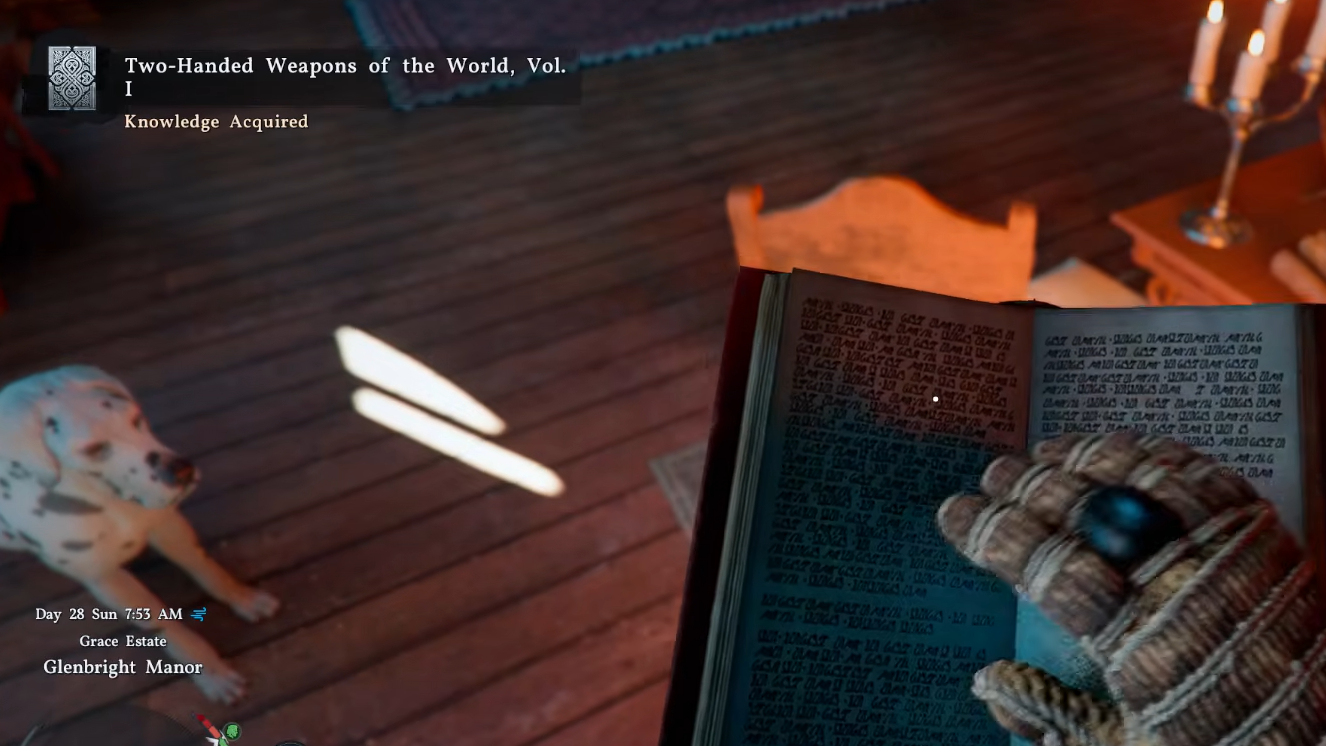 Two-Handed Weapons of the World has at least three volumes scattered across the game world. Vol. 3 is located on the third level of a spire, inside a circular room filled with bookshelves. To access it, burn the thorns blocking the entrance, then pick up a pebble near the entrance and place it in a bowl to unlock the door. The book sits on a bottom shelf slightly to the left of a specific landmark visible in the room. Use your lantern to spot it in the dim lighting.