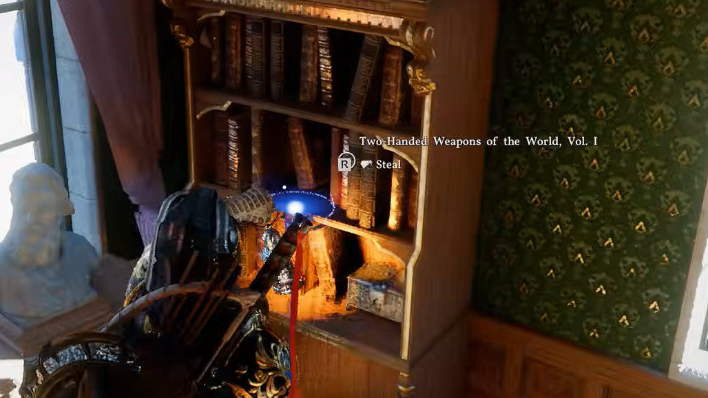Step 4: Crouch to avoid detection by the NPCs in the room. Approach the table and select "Steal" when the prompt appears. The book will be added to your inventory.