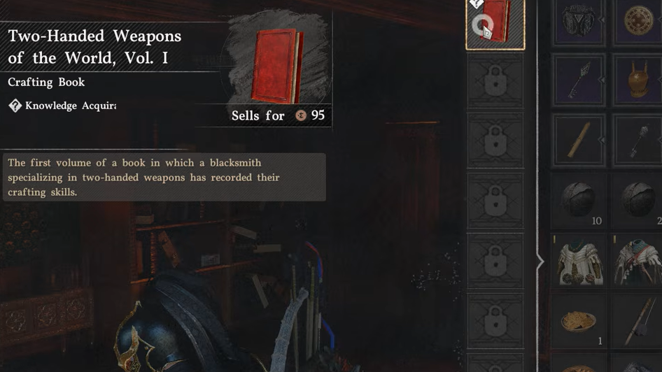 Each volume unlocks different weapon recipes. Collecting all volumes gives you access to a wider range of craftable two-handed weapons, including unique boss drops and high-tier gear.