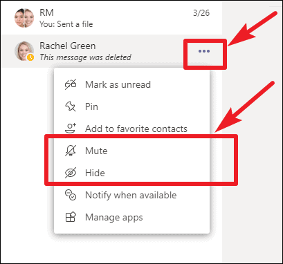 There is no way to delete a conversation thread once it’s started, but you can hide the chats you don’t want around or mute them to get rid of notifications from them. Go to ‘Chat’ from the left navigation bar. Then, go to the chat you want to hide or mute. A ‘More options’ icon (three dots) will appear. Click on it, and then select ‘Mute’ or ‘Hide’ from the context menu.