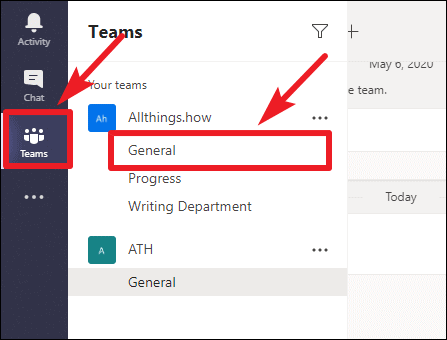 Click on ‘Teams’ on the navigation bar on the left. All your Teams will appear with Channels listed underneath it. Go to the Channel you want to chat in.