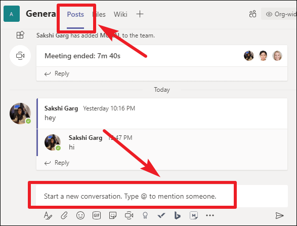Teams are made up of Channels that are dedicated places for different projects, departments, or topics that the team works on. Channels can either have all or some team members based on their creation. If you need to talk with all your team members, the Channel is the best place to do so. All Channels have the ‘Posts’ tab in them. This is where conversations happen.