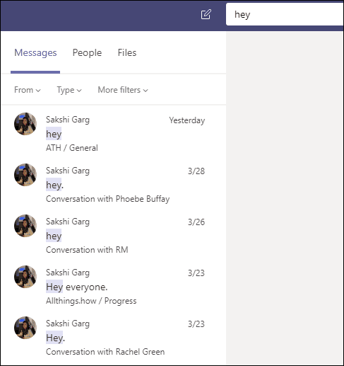 - Search for any old messages using the Command Bar: If you want to find any old messages, Command Bar is at your service again. Enter a keyword from the message you are trying to find and press the enter key. It will list all your messages containing that keyword. You can even use filters to execute a dedicated search based on Team, date, attachments, etc.