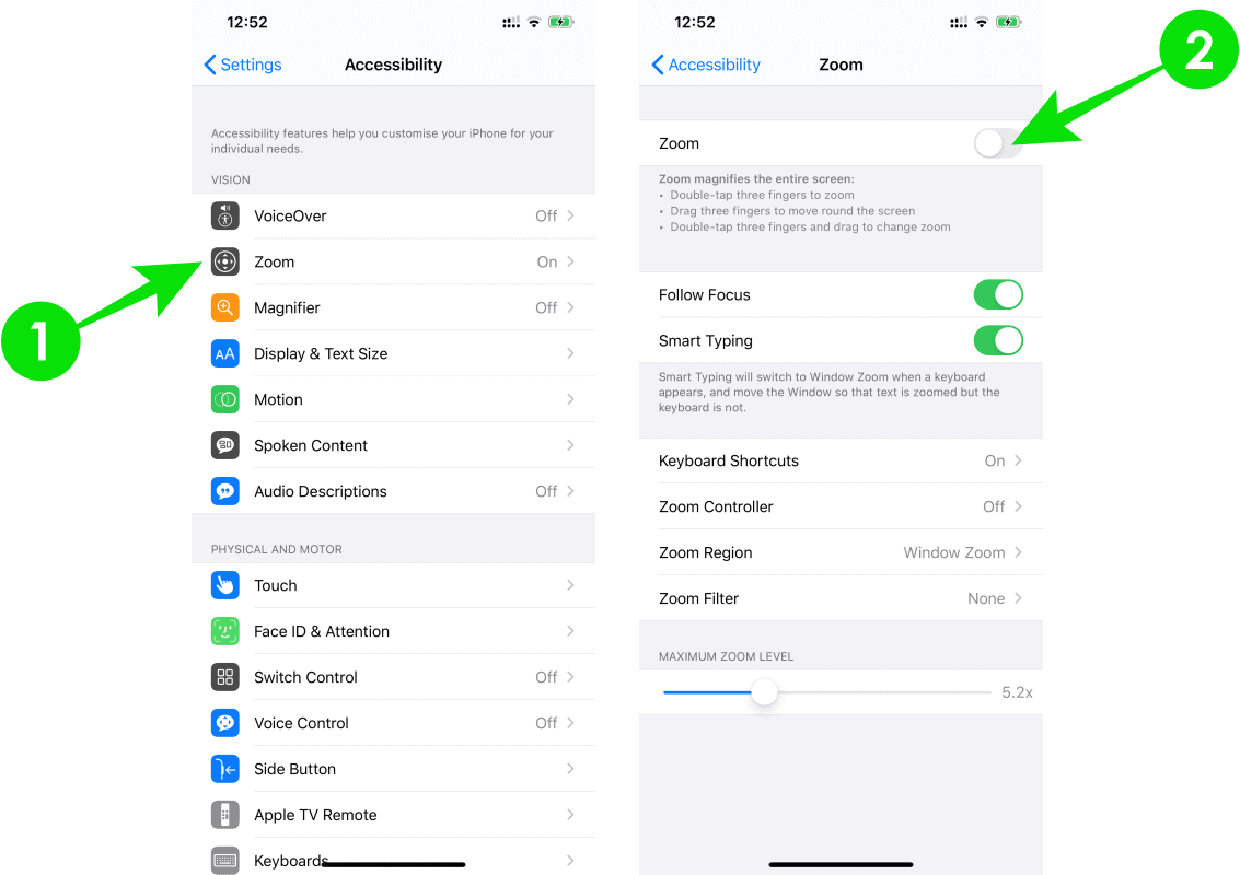 Then under Accessibility settings, tap “Zoom” and turn off the toggle switch to disable the feature.