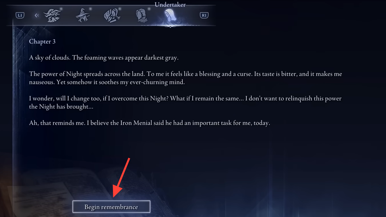 Step 3: In the Roundtable Hold hub, interact with the Journal in the right-hand corridor and open the Undertaker tab. Highlight Chapter 3 and choose Begin remembrance to enter the Realm of Remembrance and start the first quest.