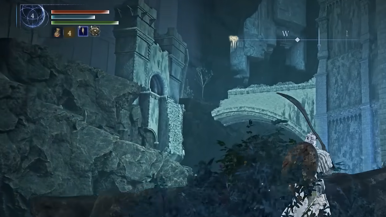 Step 1: Head toward the big northwest castle with the red quest flag. Approach the main front gate, then wrap around the outside of the walls to the left until you reach a spirit jump pad on the west side.