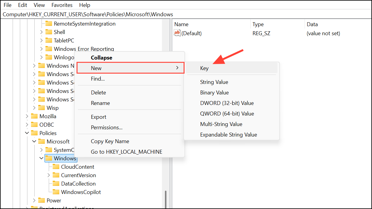 Step 3: Right-click the "Windows" key, select "New" → "Key," and name it WindowsCopilot.