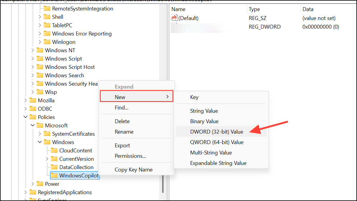Step 4: Right-click the new WindowsCopilot key, select "New," then "DWORD (32-bit) Value," and name it TurnOffWindowsCopilot.