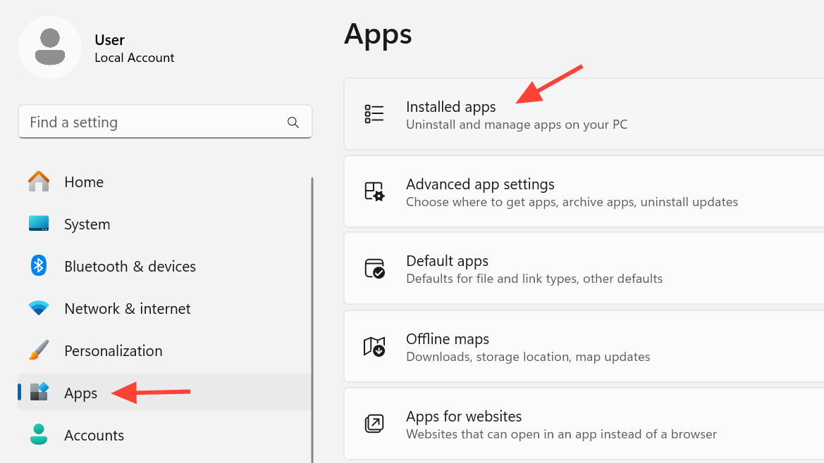- Go to Apps > Installed apps (or Apps & features on older builds).