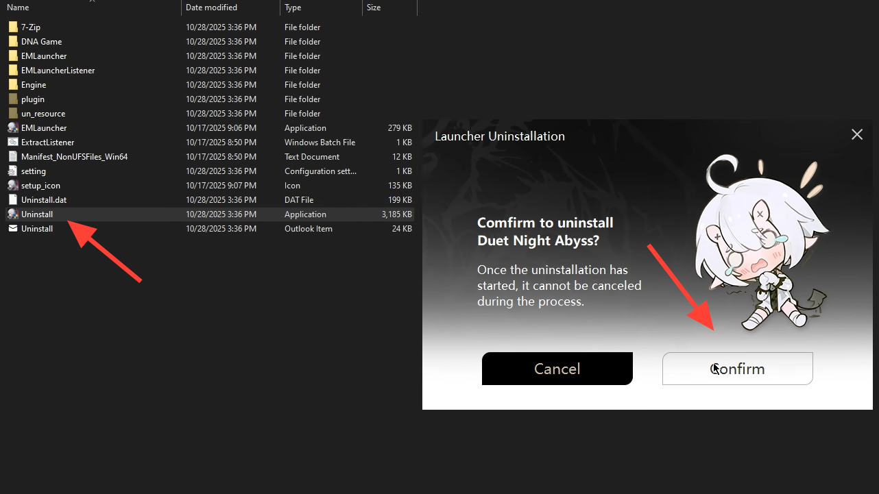 The uninstaller is designed to remove the program directory. If a Duet Night Abyss folder remains in the original install location after uninstalling (and it contains no files you need), delete it to reclaim disk space.
