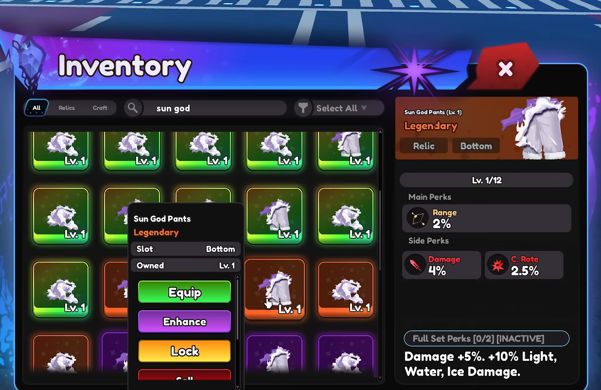 | Sun God Pants | Sun God | Marine Base Story | +5% damage, +10% Light/Water/Ice damage |