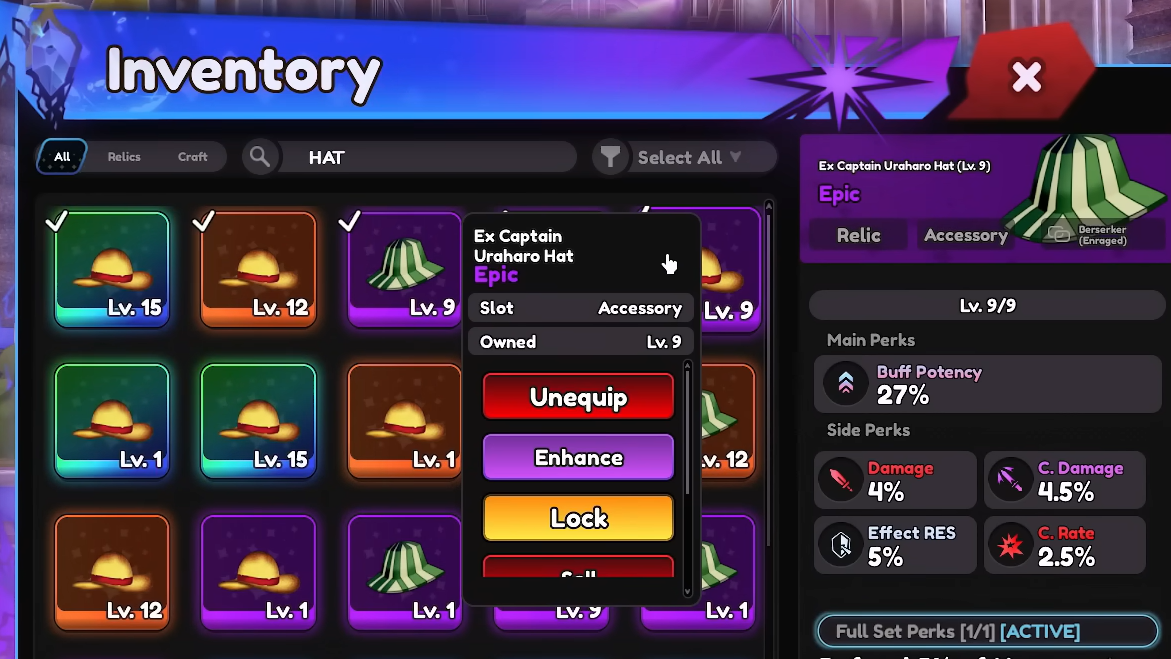 Within these sets, individual pieces carry their own effects as well. For example, Ex Captain Uraharo Pants and Cloak both provide 10% crit rate and 25% crit damage, while the matching hat is the yen-refund piece. Berserk Shinigami pants and uniform both increase normal and armor damage, while the headpiece triggers the true damage proc.