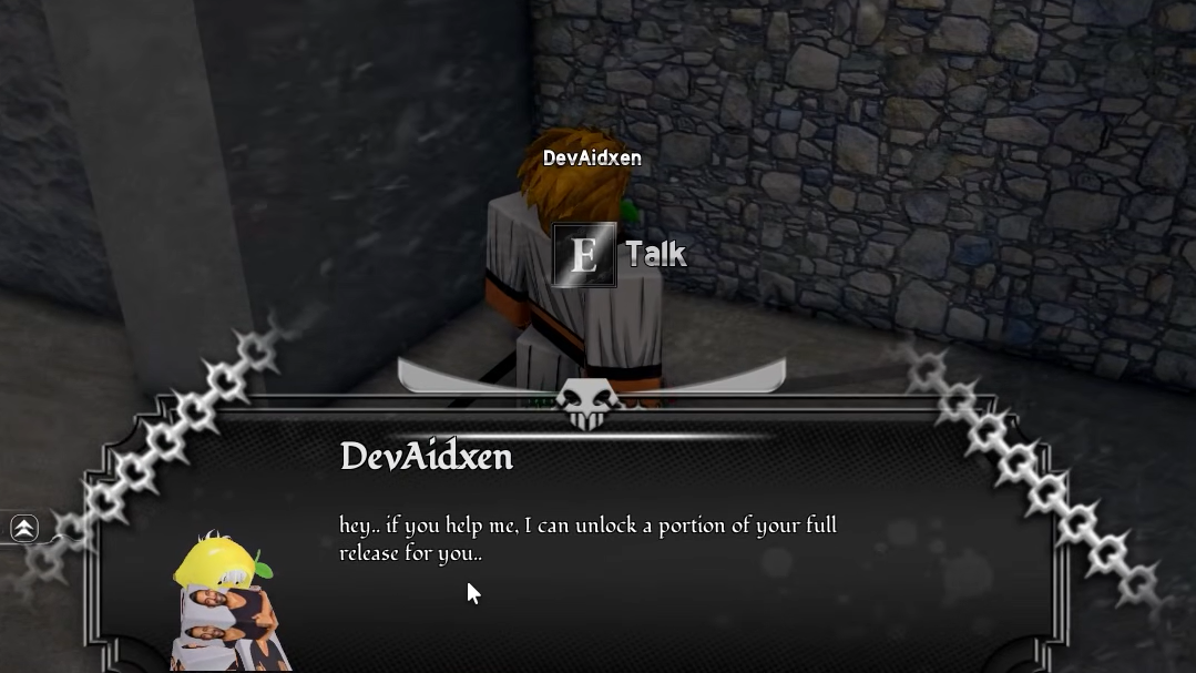 Before you can pursue full Resurrection, you must first obtain Incomplete Resurrection. This earlier form requires 200 Potential and is given by the DevAidxen NPC inside the Hueco Mundo castle. Toggle NPC locations by pressing the comma key (",") and follow the Arrancar Hub or Mysterious Person pointer until the DevAidxen pointer appears. His questline has three parts.