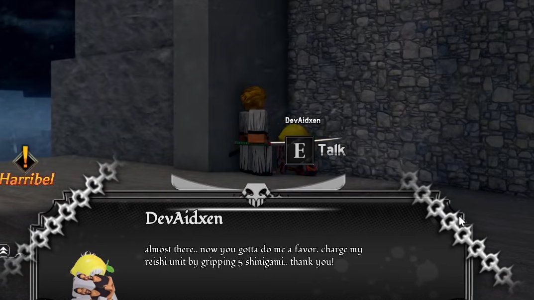DevAidxen's second task is a PvP objective. You need to find and grip five Shinigami (Soul Reaper) players. Because this depends on encountering opposing-faction players who are willing — or unable — to fight back, it can be the trickiest step.