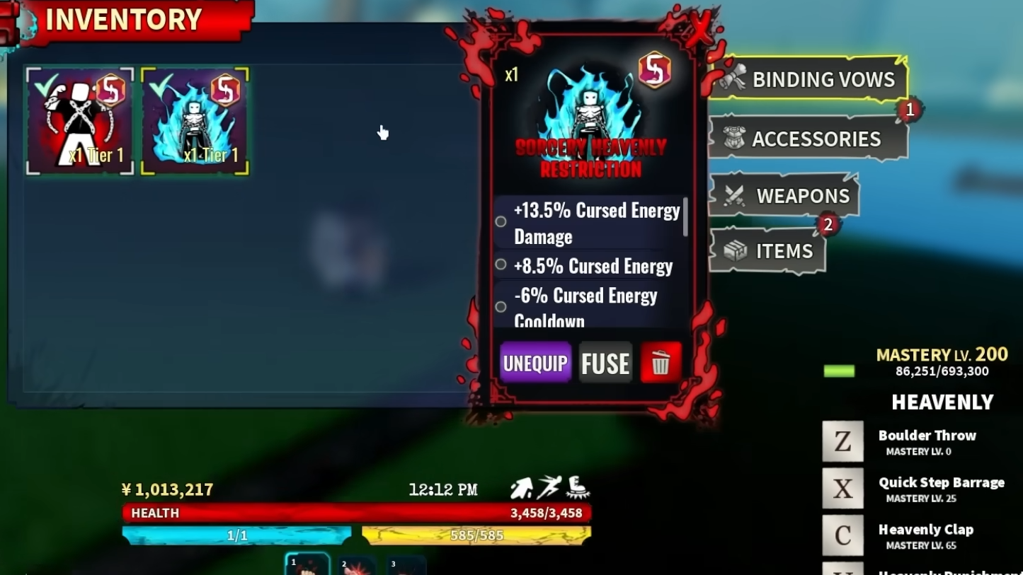 Physical Heavenly Restriction (PHR) is a Special Grade Binding Vow obtainable only through the Binding Vow Spin. It has a 0.15% drop chance, making it one of the rarest items in Kaizen.