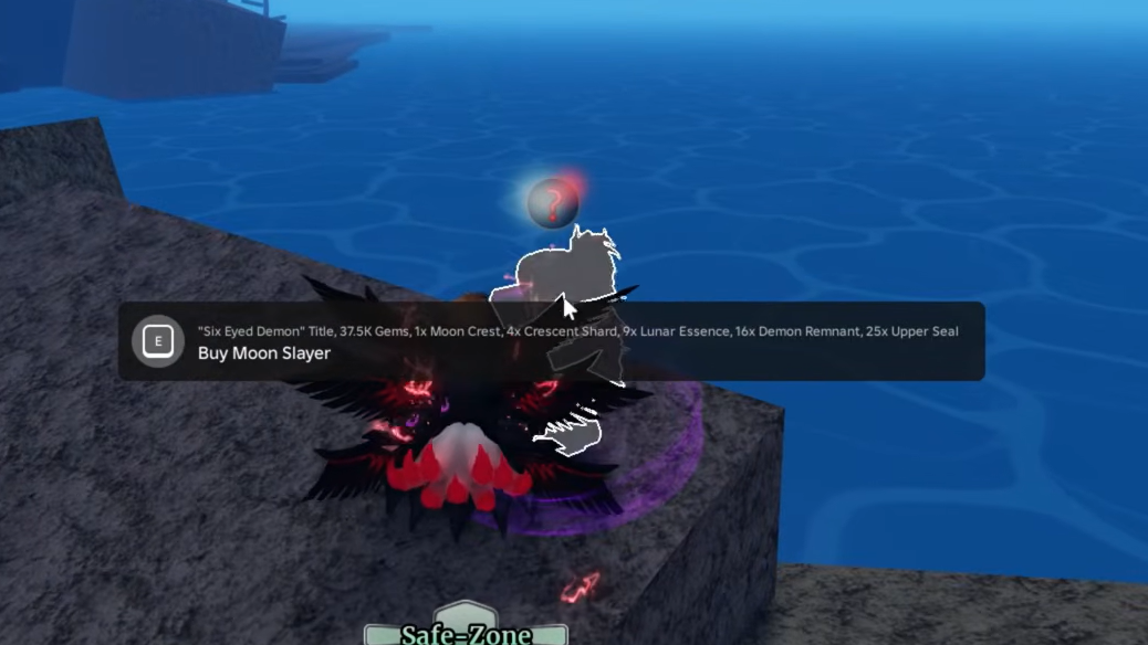 You buy Moon Slayer from the Moon Slayer Trainer NPC at Boss Island. From the island's spawn point, head straight to the opposite end — the NPC stands on a rock facing the water. Interacting with them reveals the full shopping list. Every material except Upper Seals comes from defeating the Moon Slayer boss, so the grind is self-contained on a single island.