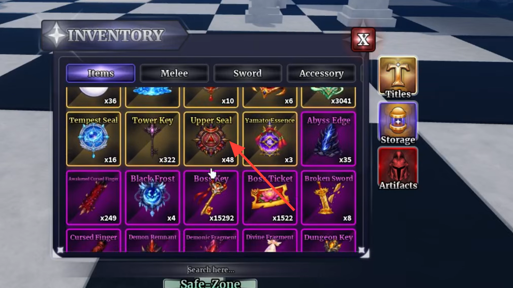 Stock up on a large pile before heading to Boss Island. You'll burn through Upper Seals quickly because they're needed for three separate purposes: purchasing Moon Slayer (25), summoning the boss (1–4 per fight depending on difficulty), and later unlocking the F move (85).