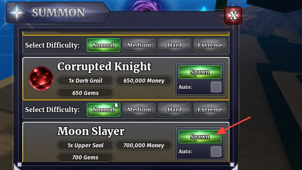 On Boss Island, talk to the Boss Summoner NPC and scroll down to find the Moon Slayer option. The summoning cost scales with difficulty:
