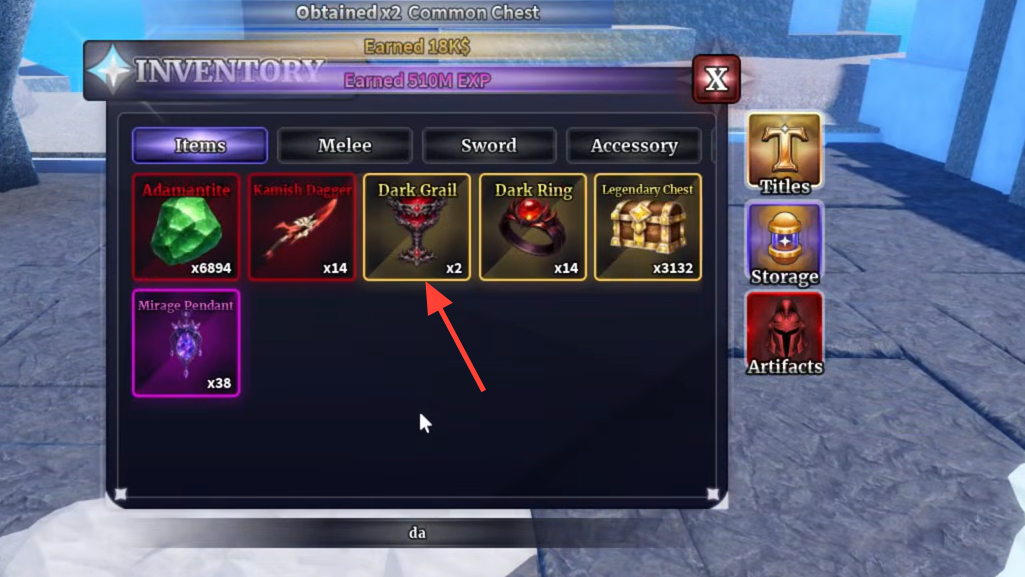 Dark Grails drop from regular NPCs throughout Sailor Piece and can also appear in chests (secret, mythical, and legendary). You will need a large supply — 1 per boss spawn, 25 for the weapon unlock, and an additional 85 if you plan to unlock the F Move later. That adds up to well over 100 total.