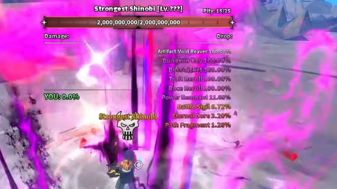 With 2 billion HP, each kill can take a while if your build isn't optimized. Equip your strongest swords or combat specs and make sure your Skill Tree, stats, and accessories are fully upgraded before you start farming. Blessings, races, clans, and traits that boost luck will improve your odds of landing the rarer drops on each kill.