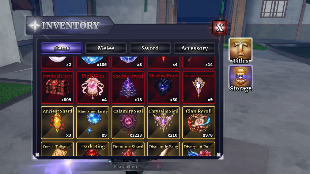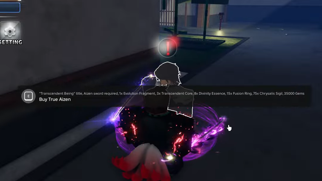 Step 4: Once you have all the materials, return to the True Aizen NPC. Pay the 35,000 Gems and 75 Chrysalis Sigils to receive the True Aizen sword. You'll immediately have access to most of its moveset — but the F-move slot will be empty.