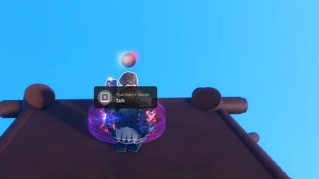 The True Aizen F Master NPC is located on the roof of the tallest building toward the back of Soul Society Island. Interact with him (press E on PC) to begin a chain of three sequential quests. You must own the True Aizen sword before the NPC will talk to you.