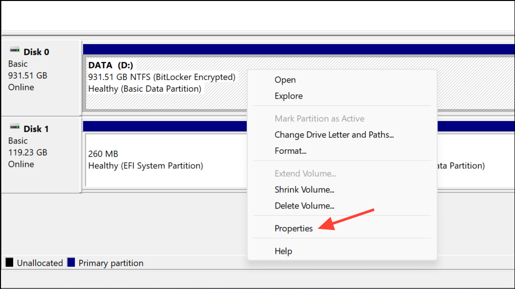 Step 3: Confirm your disk is MBR. Press Win + X and select Disk Management. Right-click your system disk, choose Properties, and check the Volumes tab for "Partition style."