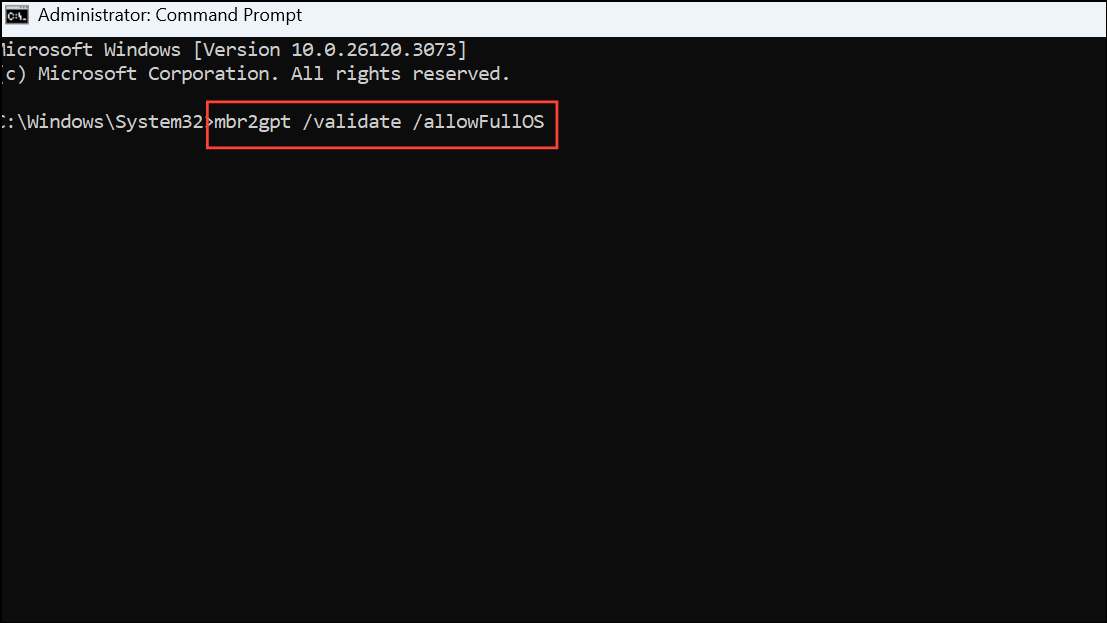 Step 5: Run the MBR2GPT tool to validate the disk. Enter:
