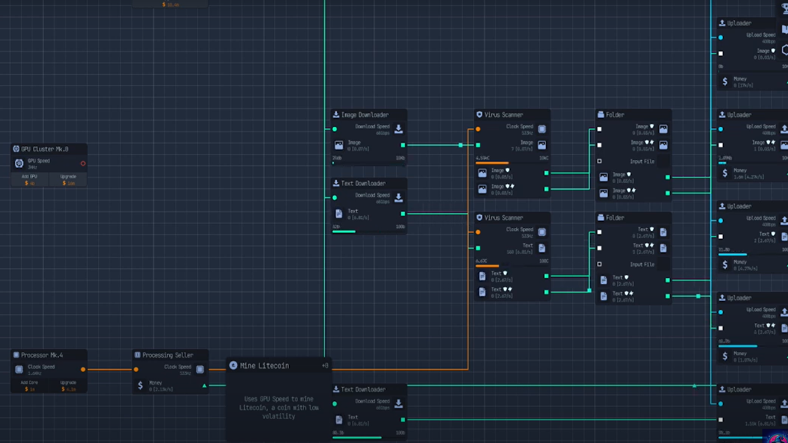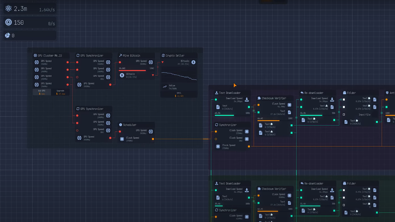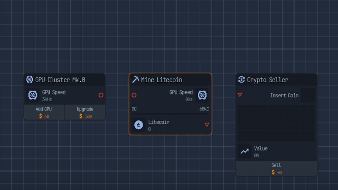 Crypto unlocks when you add a GPU Node (the one with the fan icon). From there, you’re building a simple chain: GPU power feeds a Miner, and the Miner’s output feeds a Crypto Seller that turns coins into cash.