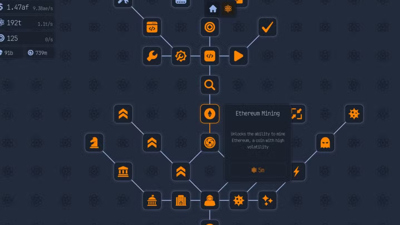 Choice is gated by progression. Litecoin is available as soon as you unlock GPUs. Bitcoin and Etherium arrive via the Research Tree. Tether is unlocked with Tokens and behaves differently.