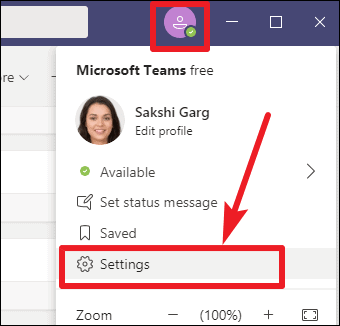 Step 1: Open Microsoft Teams and click on your 'Profile' icon in the Title Bar. Select 'Settings' from the dropdown menu.