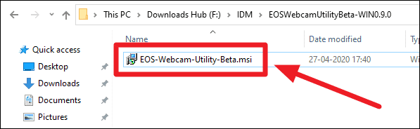 Step 1: Install the EOS Webcam Utility on your Windows 10 computer by running the EOS-Webcam-Utility-Beta.msi installer extracted from the zip file.
