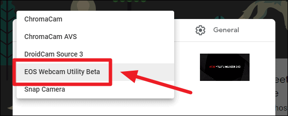 Step 3: In the 'Camera' drop-down menu, choose 'EOS Webcam Utility Beta' from the list of available devices. This selection will persist for future meetings unless changed.